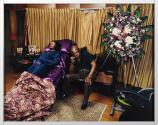 Om konstverketPå en brits klädd i blankt lila tyg ligger en död kvinna på lit de parade. En svartklädd man bredvid henne ser rakt in i kameran med allvarstyngd blick. Det guldfärgade draperiet och den praktfulla blomsteruppsatsen talar ett annat språk än de enkelt inramade familjefotografierna och träningsredskapet till höger i bild – som om detta i mer än en bemärkelse är en plats där två världar möts. I sina färgfotografier utforskar Deana Lawson svarta erfarenheter i relation till historia, myt och andlighet, ofta genom iscensatta porträtt fyllda med symbolik och personliga detaljer. Hennes verk förenar västerländska och afrikanska porträttraditioner, i miljöer där det personliga och kulturella möts.