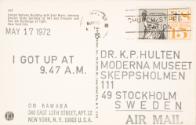 Beskrivning "I GOT UP"- serien utgörs av vykort med på baksidan stämplad information om klockslag när On Kawara gick och var han vid tillfället befann sig. On Kawara sände två vykort per dag från olika platser i världen, till vänner och bekanta, främst inom konstvärlden. Serien påbörjades i Mexico City 1968 och pågick utan avbrott till september 1979, då On Kawara var i Stockholm. Under sin vistelse i Stockholm blev han bestulen på sitt material och därför avslutade han "I GOT UP". Samtliga 116 vykort i Moderna Museets samling är sända till Pontus Hultén och täcker ett tidsspann mellan den 14/5 - 7/9 1972. Signaturer, påskrifter och märken Signerad med stämpel som en del av konstverk, Stämplad text på vykortets baksida: MAY 17 1972 I GOT UP AT 9.47 A.M. ON KAWARA 340 EAST 13TH STREET, APT.12' NEW YORK, N.Y. 10003 U.S.A. DR. K.P.HULTEN MODERNA MUSEET SKEPPSHOLMEN 111 49 STOCKHOLM AIR MAIL". Utställningshistorik i urval Pontus Hulténs samling (2004) Moderna Museet, Stockholm On Kawara - Silence (den 6 februari 2015 - den 3 maj 2015) The Solomon R. Guggenheim Museum Sju rum och en trädgård. Rashid Johnson och Moderna Museets samling (den 28 september 2023 - den 22 september 2024) Moderna Museet, Stockholm Moderna Museets utställningskataloger Pontus Hulténs samling Bibliografi Pontus Hulten: artisti da una collezione; Milano, Skira 2006 [utställningskatalog: Venezia, Instituto Veneto di Scienze, Lettere ed Arti, Palazzo Cavalli Franchetti, 5 marzo - 9 luglio 2006; Con la collaborazione di Moderna Museet], s. 137. Pontus Hulténs samling..., red. Iris Müller-Westermann, Nathalie Meneau, Teresa Hahr, Margareta Helleberg, Moderna Museets utställningskatalog nr 321, Stockholm, 2004,s. 181. On Kawara. continuity/discontinuity 1963-1979, red. Björn Springfeldt, [utställningskatalog] Moderna Museet # 169, 1980, s. 105 (om verket i allmänhet).