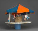 Teknik/MaterialParasoll, målade gipsfigurer, återanvänd bordsskiva, el-motor, 2 monitorer, video